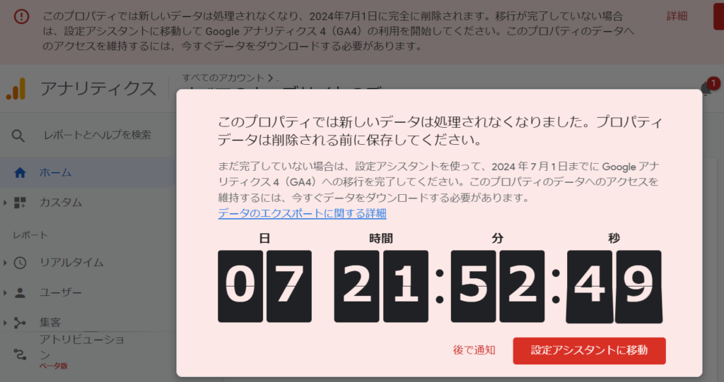 GA4をまだ設定しない場合は、下記のように「アラート」されます。