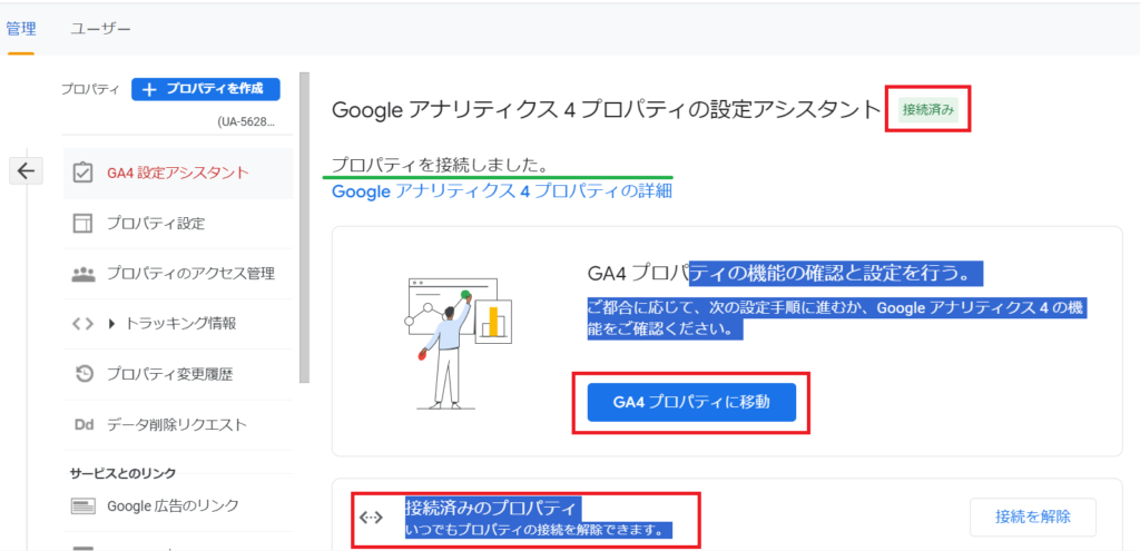 GA4プロパティを設定していきます!今は、下記のように「未接続」になっていますので、