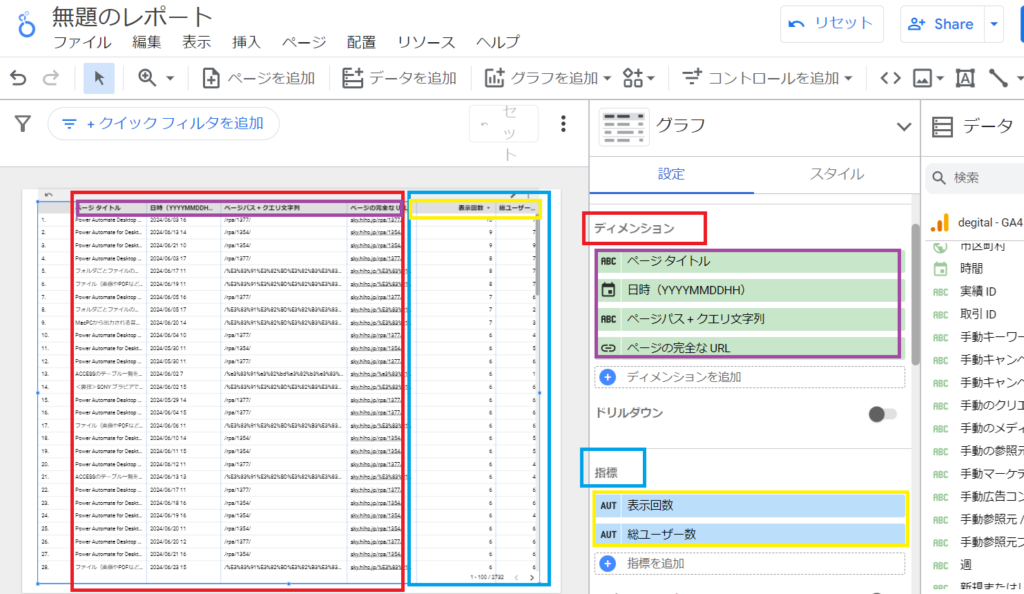 このような感じで、ページのURLとそれに対する表示回数をレポートにすることができます。