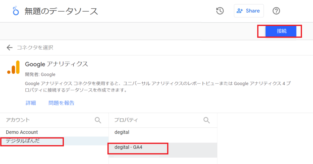<補足>いつもGA4でレポートを作成するときには、データソースで接続設定しておくと便利です!!