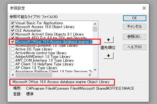 「参照設定」の「Microsoft Office 16.0 Access database engine Object Library」にチェックされているか確認します。チェックがなければ、チェックをいれます。