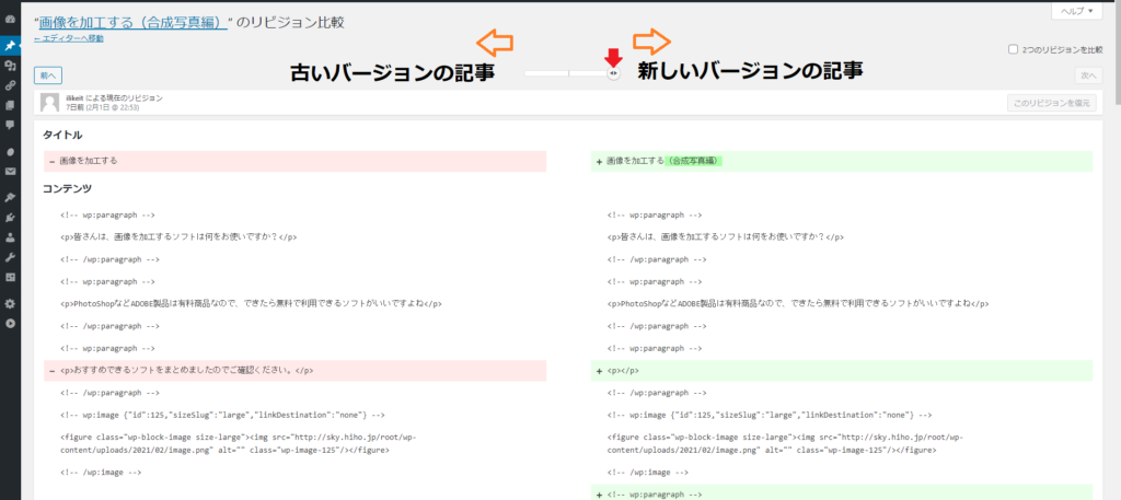 「このリビジョンを復元」をクリックすることで、希望する変更前の状況に戻すことができます。