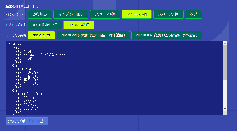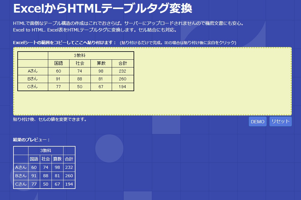 Excelから貼り付けるだけでHTMLテーブルを作成します。セル結合にも対応。インデントも複数から選べます。HTMLで面倒なテーブル構造の作成はこれでおさらば。データはJavaScriptで処理され、サーバーにアップロードされませんので機密文書も安心。