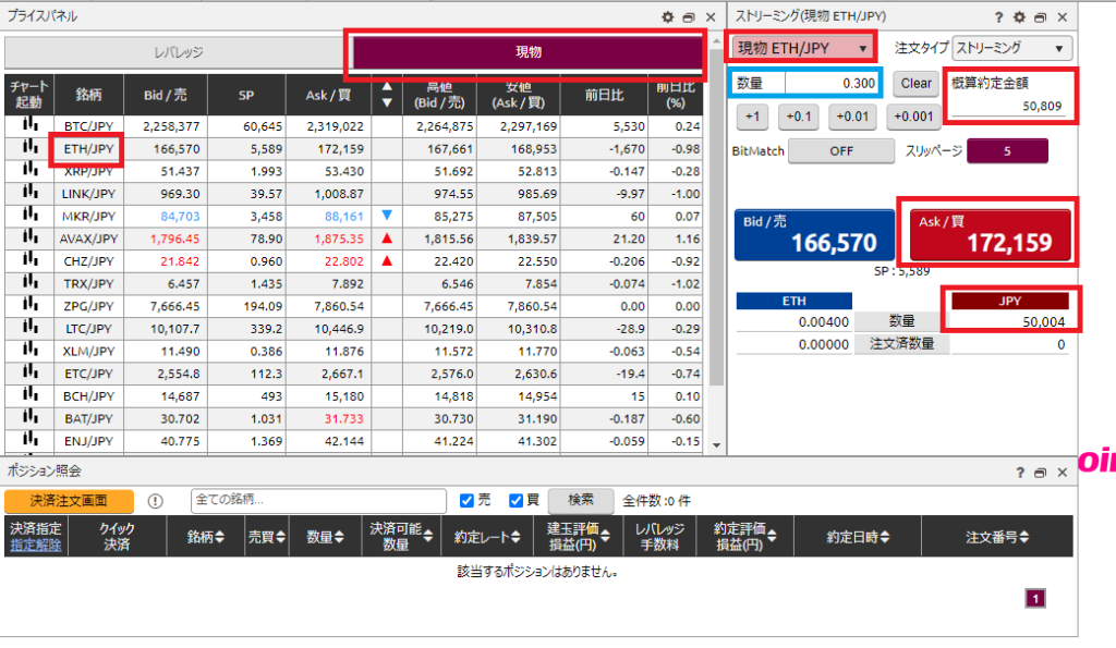 「現物」のタブをクリックします。次に数量を決め、「Ask/買」ボタンをクリックして約定すれば購入完了です。下記のように、総資産に反映します。