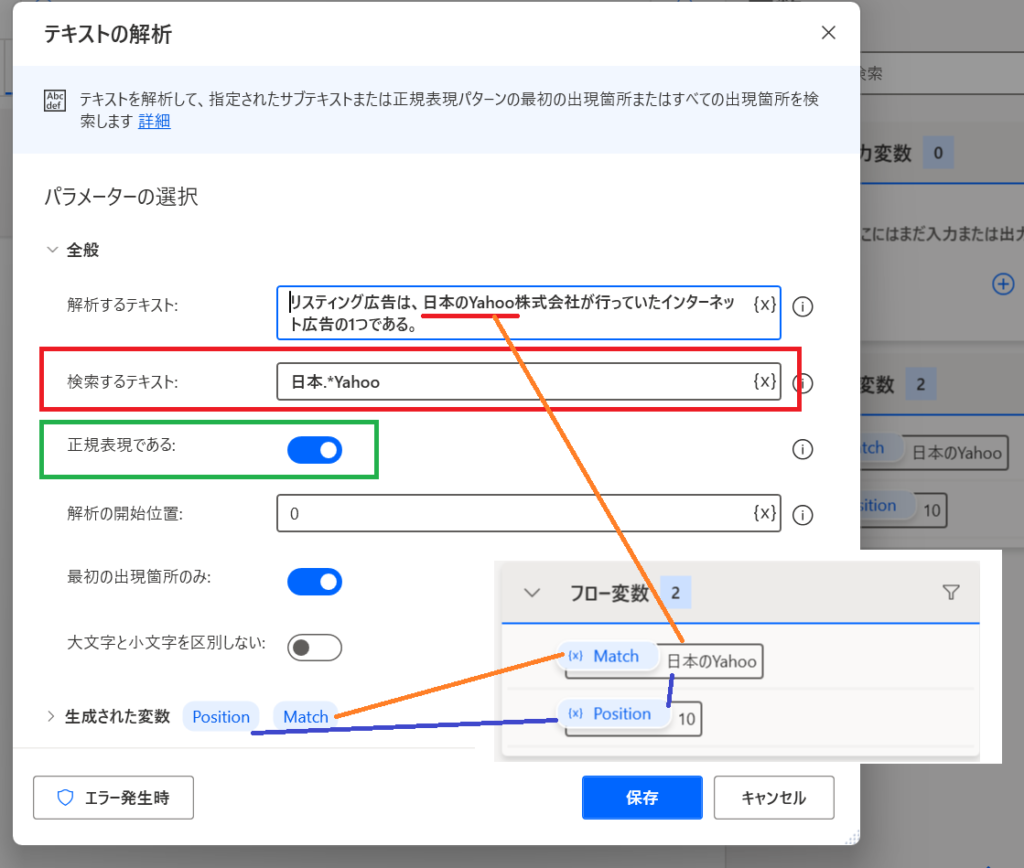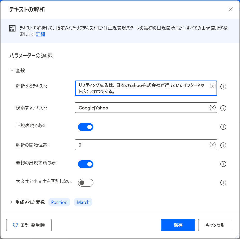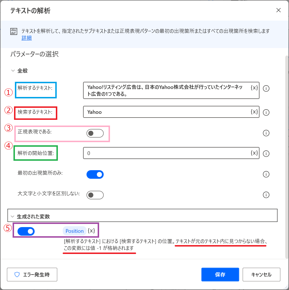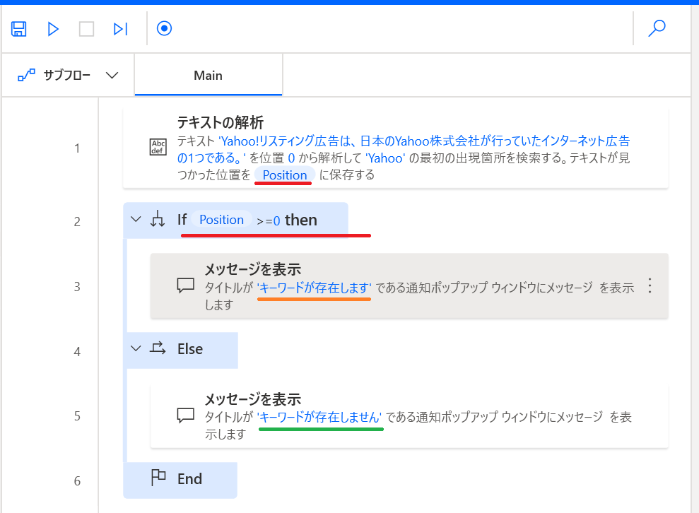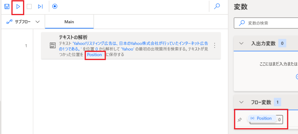 「検索するテキスト」は「Yahoo」で1番目です。実行すると、0と生成された変数のPositionに入ってきます。「Yaooo」で実行すると、その文字列は存在しませんのでPositionには-1が入ります。