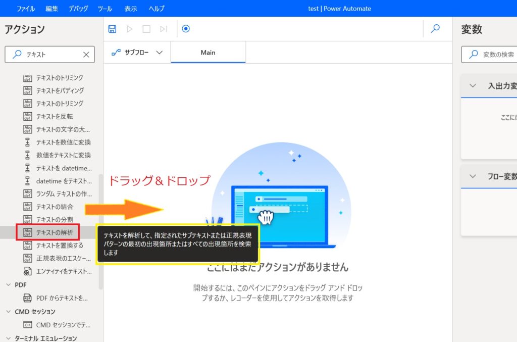 「テキストの解析」のアクションを選択し、ドラッグ&ドロップします。