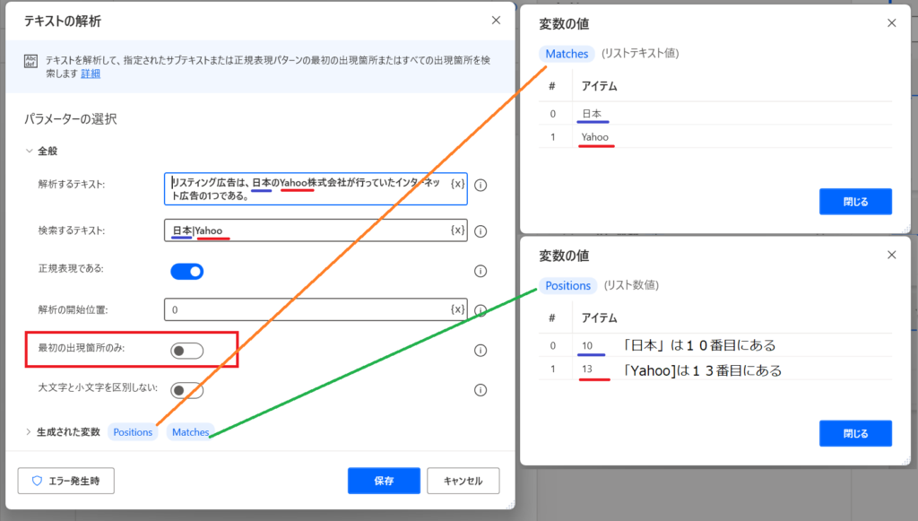 その場合、「最初の出現箇所のみ」をOFFにすることで、それぞれヒットした場所を配列で返します。