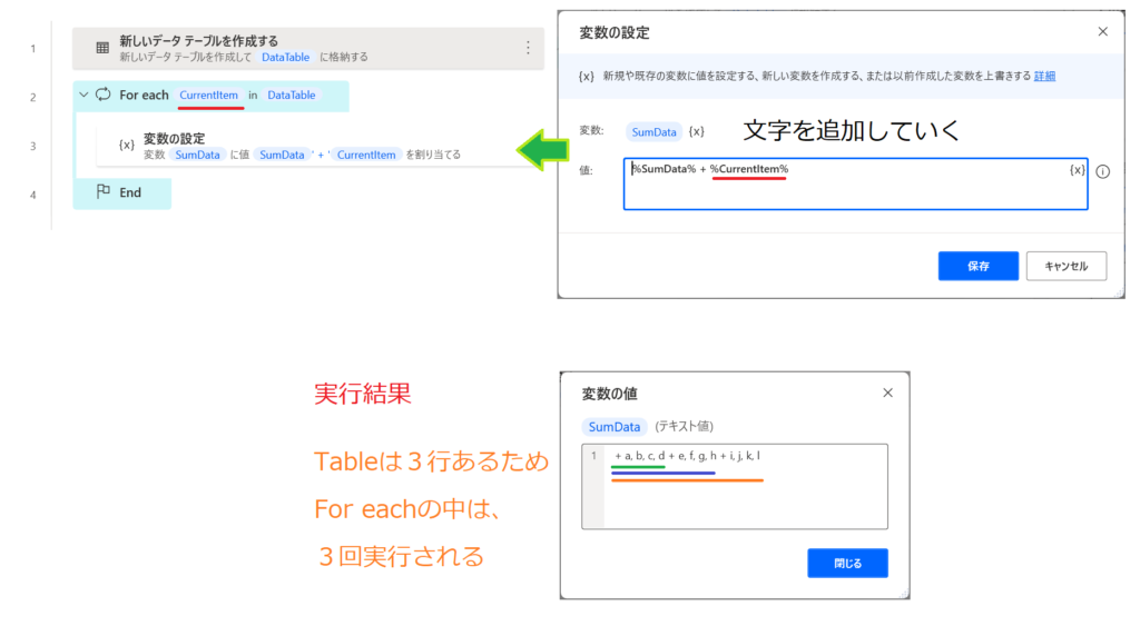 今回の場合、「変数の設定」が何回、実行されるかというと、DataTable(3行)の3回です。